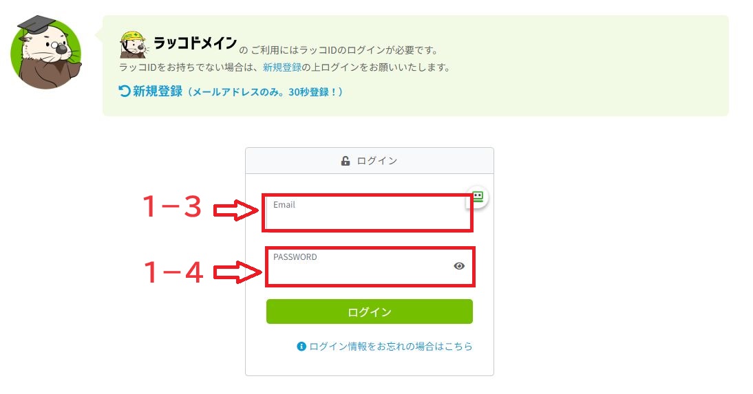 1-3,4)ラッコドメインの登録メールアドレス、パスワード