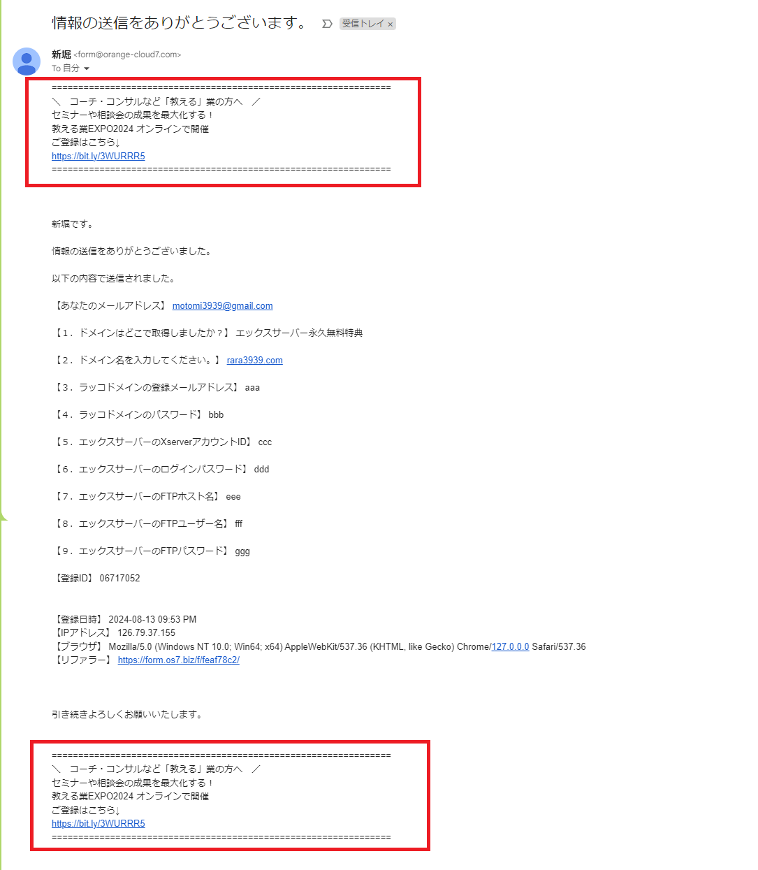 フォームを送信すると、1番最初に入力したアドレスに、新堀よりメールが届きます。