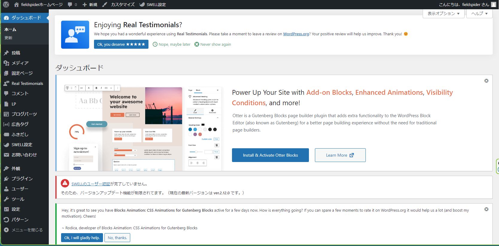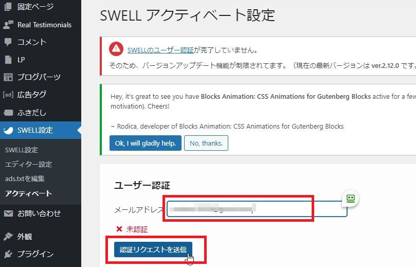 今回は、そのワードプレスにログインして、その中からSWELLの認証依頼を行うことになります。