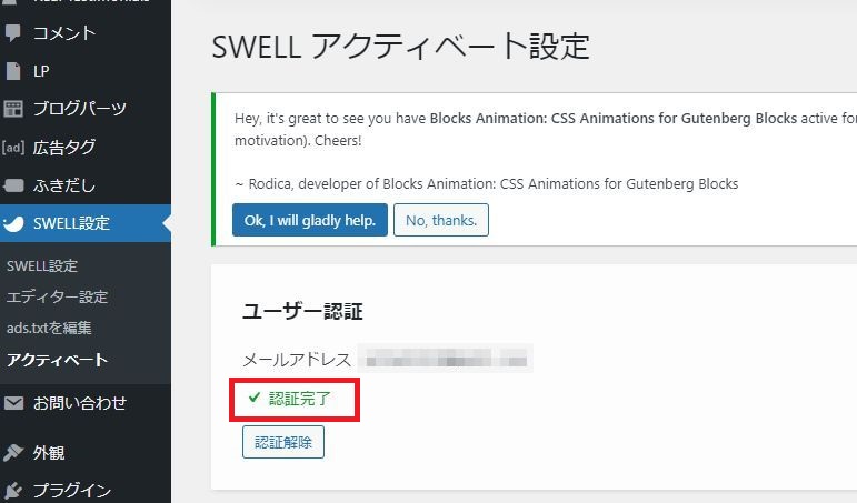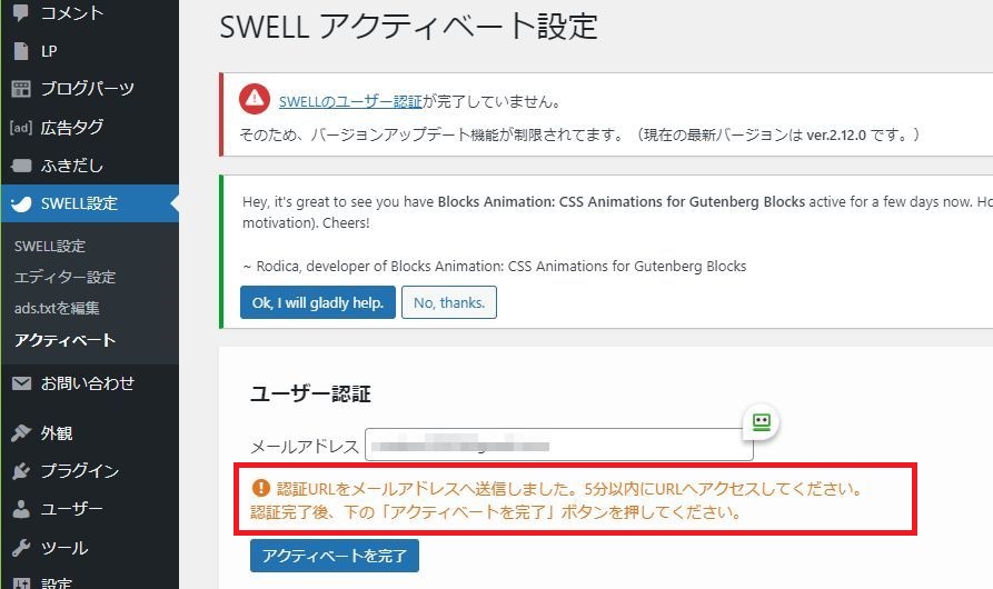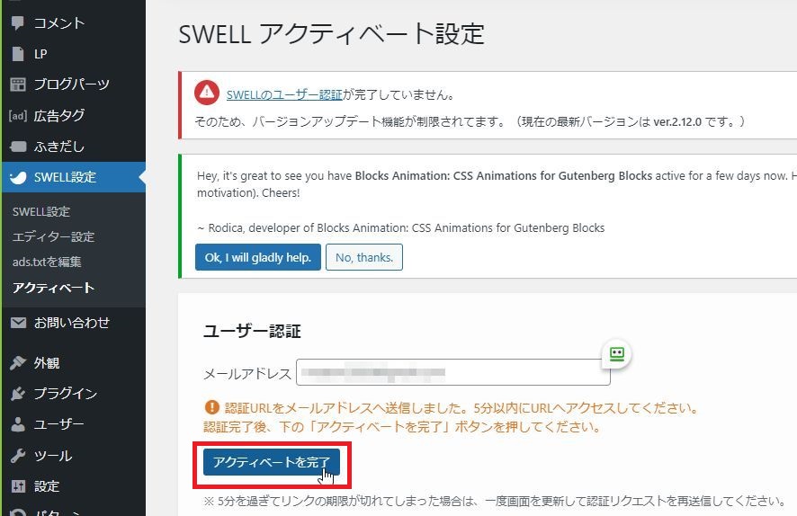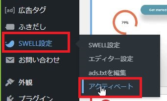 左側にずらっとメニューが並んでいますが、その中の「SWELL設定」にカーソルを合わせると、さらにメニューが表示されます。それの「アクティベート」をクリックしてください。