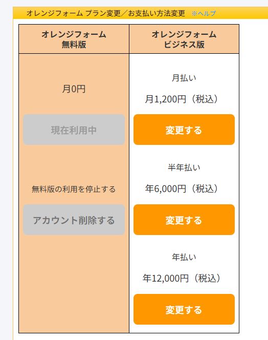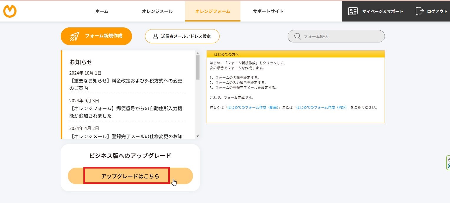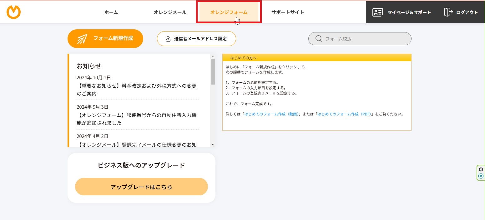 このページでは、オレンジフォームに申し込む方法を図解します。有料版にアップグレードする方法も解説しています。