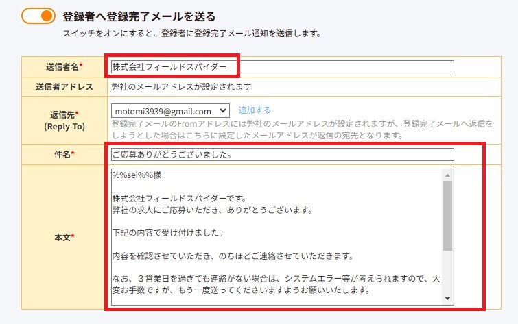たとえば、「%%sei%%」は「姓」とあります。つまり、自動で応募者の名字に置き換わる、ということです。