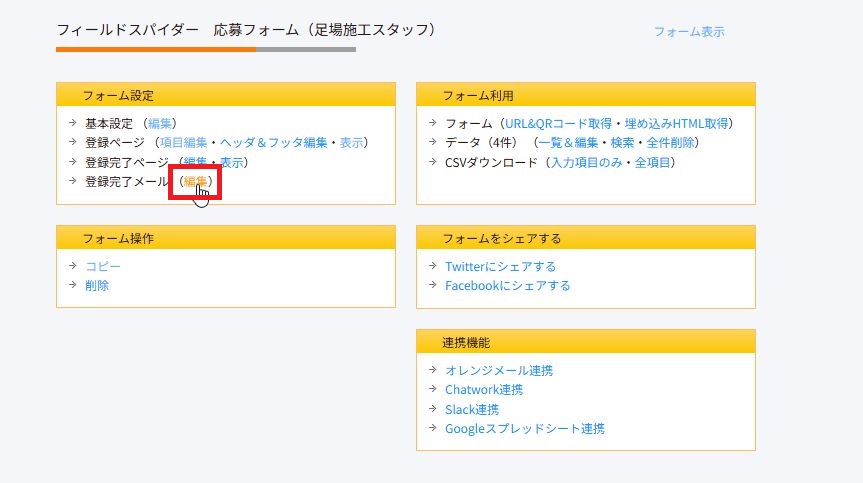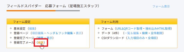 アドレスを変更したいフォームをクリックで選択します。自動返信メールの送信先は、フォームごとに設定されています。