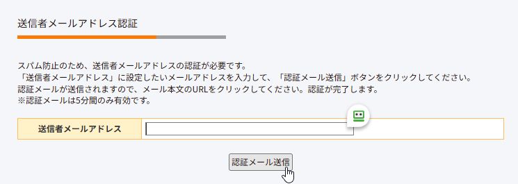 送信者メールアドレス認証画面のここに、登録したいアドレスを入力して送信します。